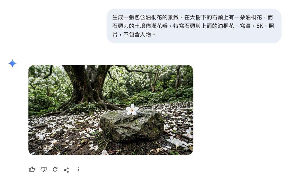 舉例來說,筆者以Gemini,輸入「生成一張包含油桐花的景致,在大樹下的石頭有一朵油桐花,而石頭旁的土壤佈滿花瓣,特寫石頭上與上面的油桐花,寫實,8K,照片,不包含人物。」得到以下的圖片,而這樣的圖片是否能受著作權保護呢?