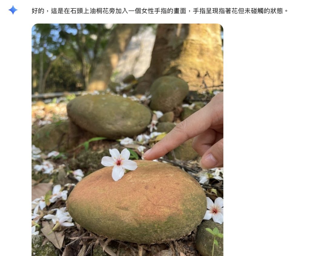 筆者要求Gemini在原本的照片上,再加入一女性手指,手指著花但不要碰到花。後者由生成式AI生成的圖片是否受著作權保護呢?筆者本人所拍攝的原始照片可能是受攝影著作保護的著作,應該是較無疑義的,而就單純輸入提示詞增加手指頭之圖片,僅是單純輸入提示詞所為之調整,一般而言應該是不會另外構成新的著作,但此僅是針對本張生成圖片的情形,實際上不排除透過前述提及使用生成式AI之工具,持續對原照片全部或局部進行生成之呈現,投入足夠的人類精神與創意,而可能受到保護的情形(需個案認定)。所以,生成式AI所生成的照片是否受保護,重點還是取決於有無人類創意的實際投入而定。